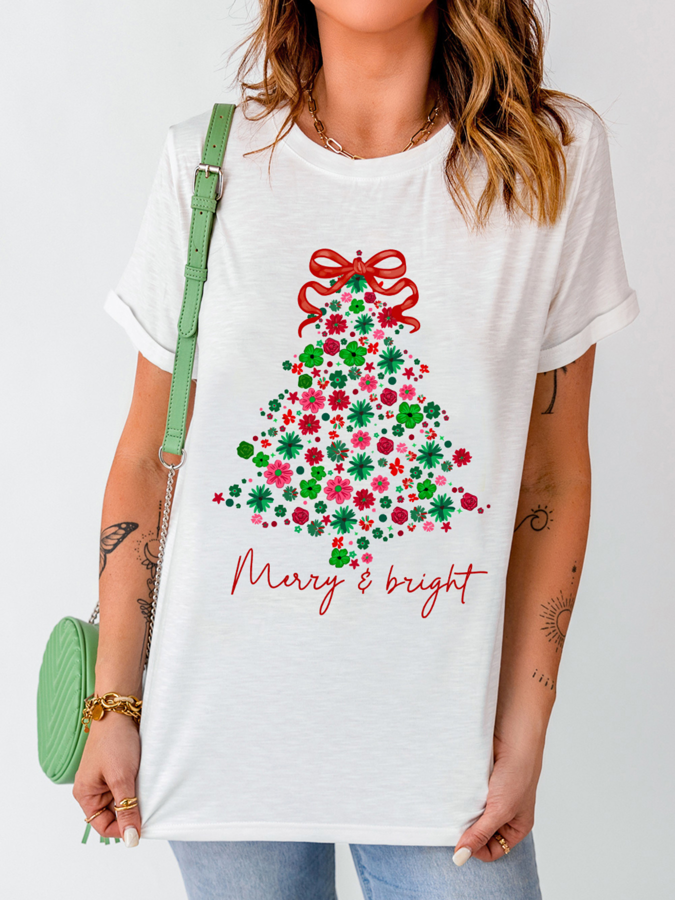 Merry & Bright Floral Christmas Tree Graphic T Shirt