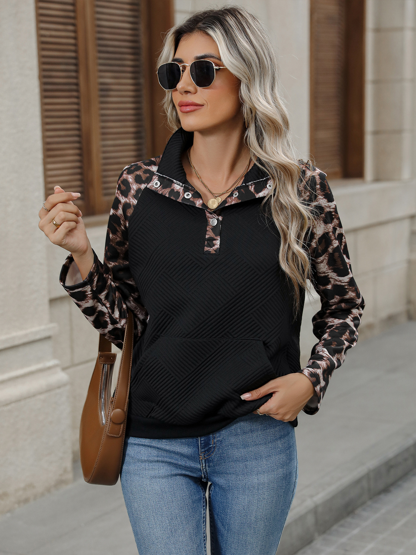 Leopard Print Sleeve Quarter Snap Sweatshirt