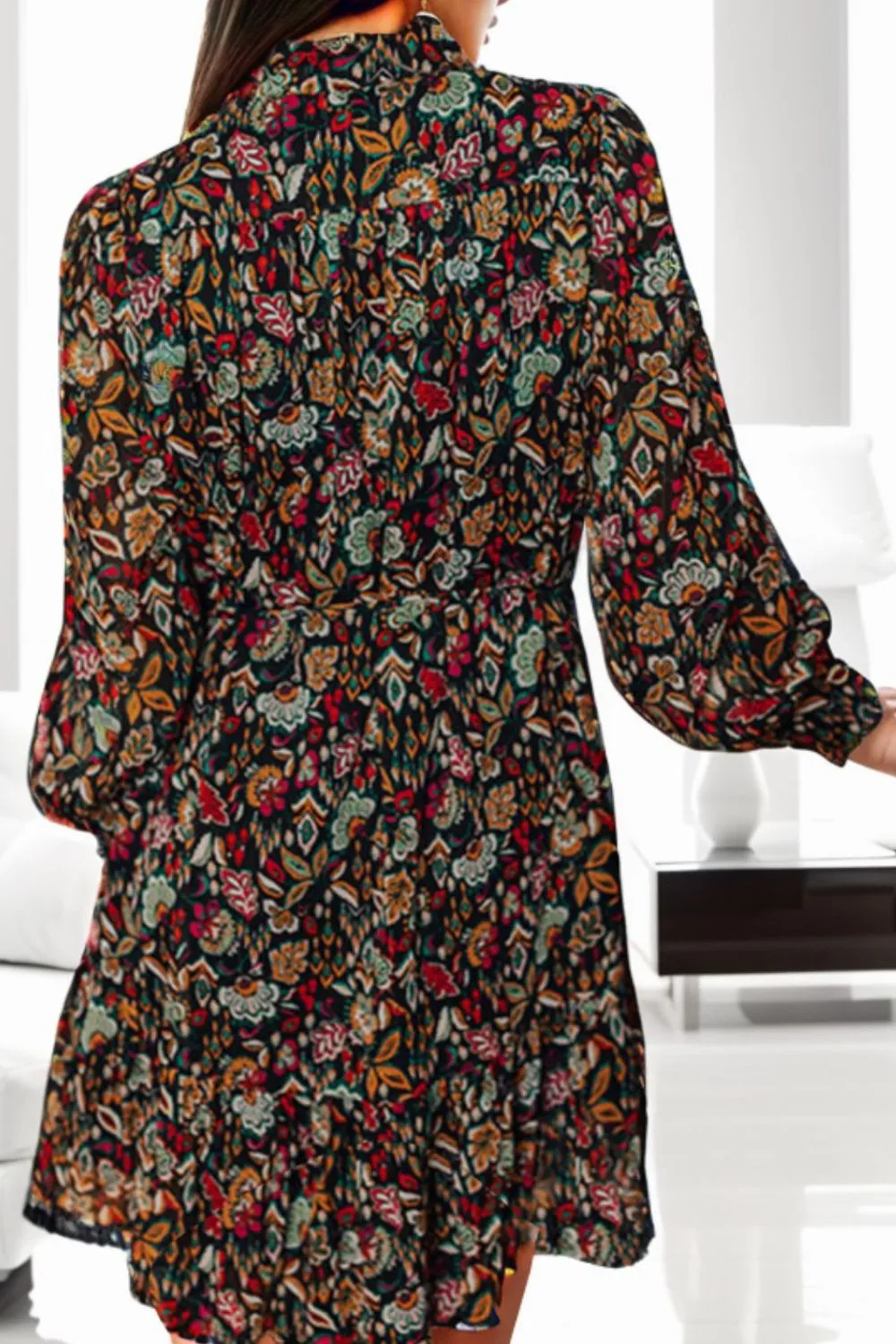 Printed Notched Long Sleeve Dress