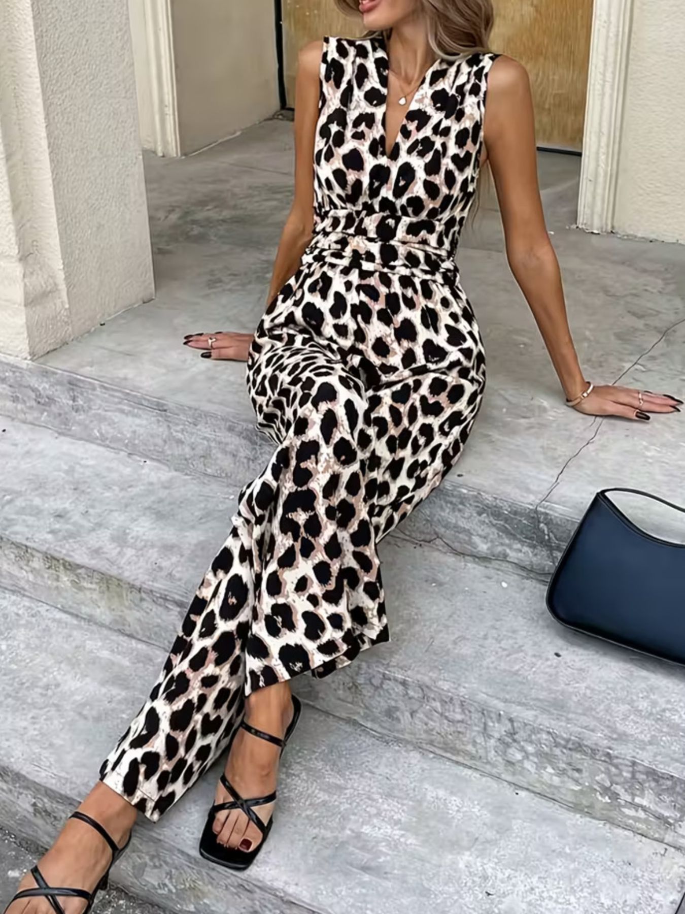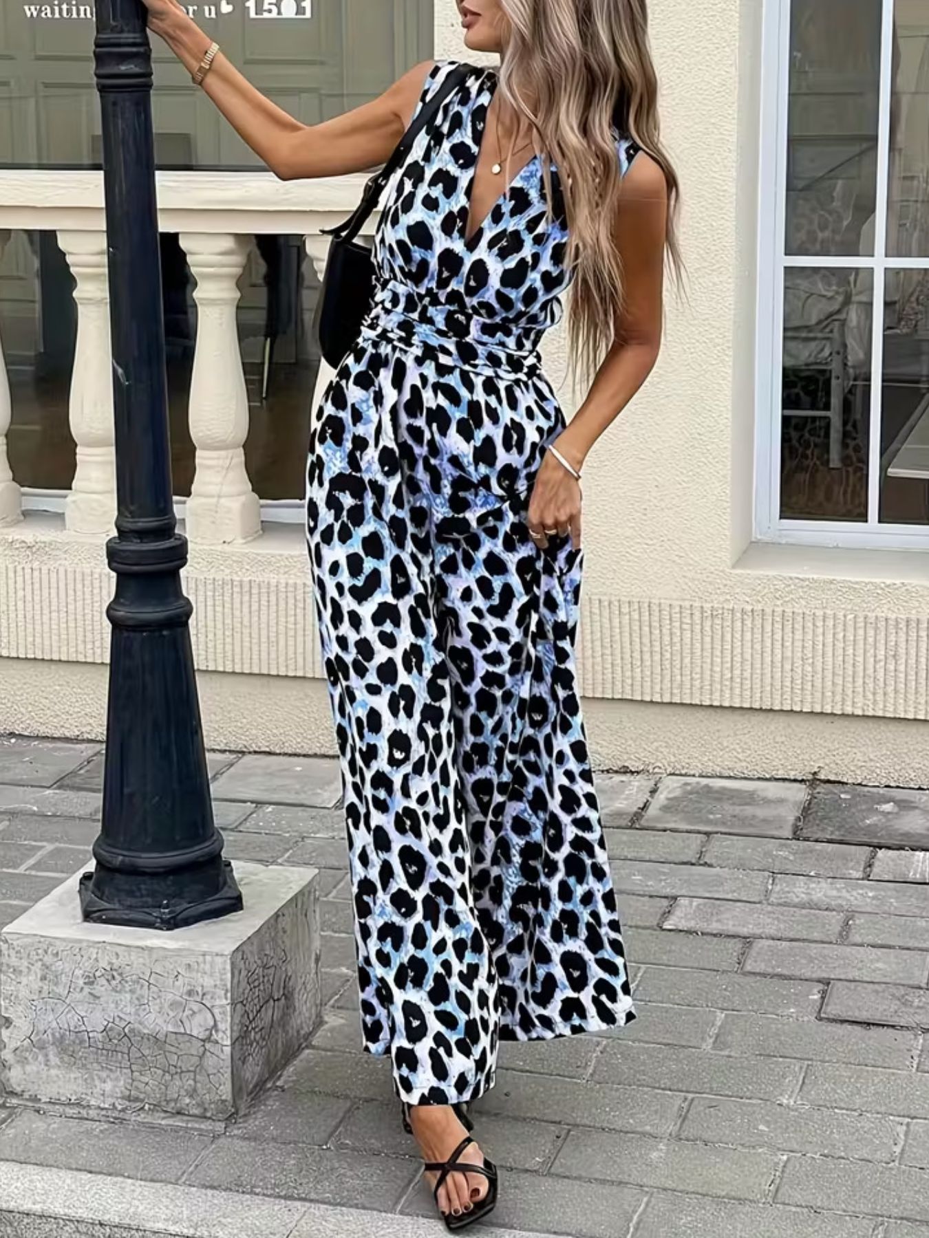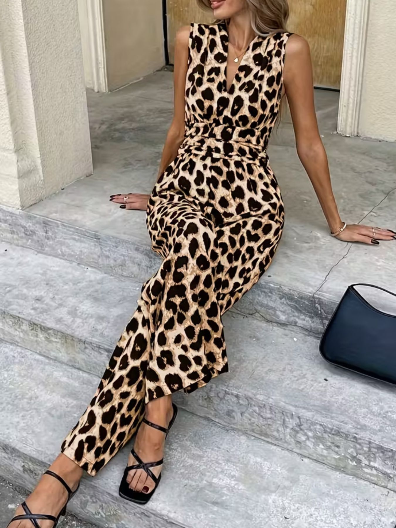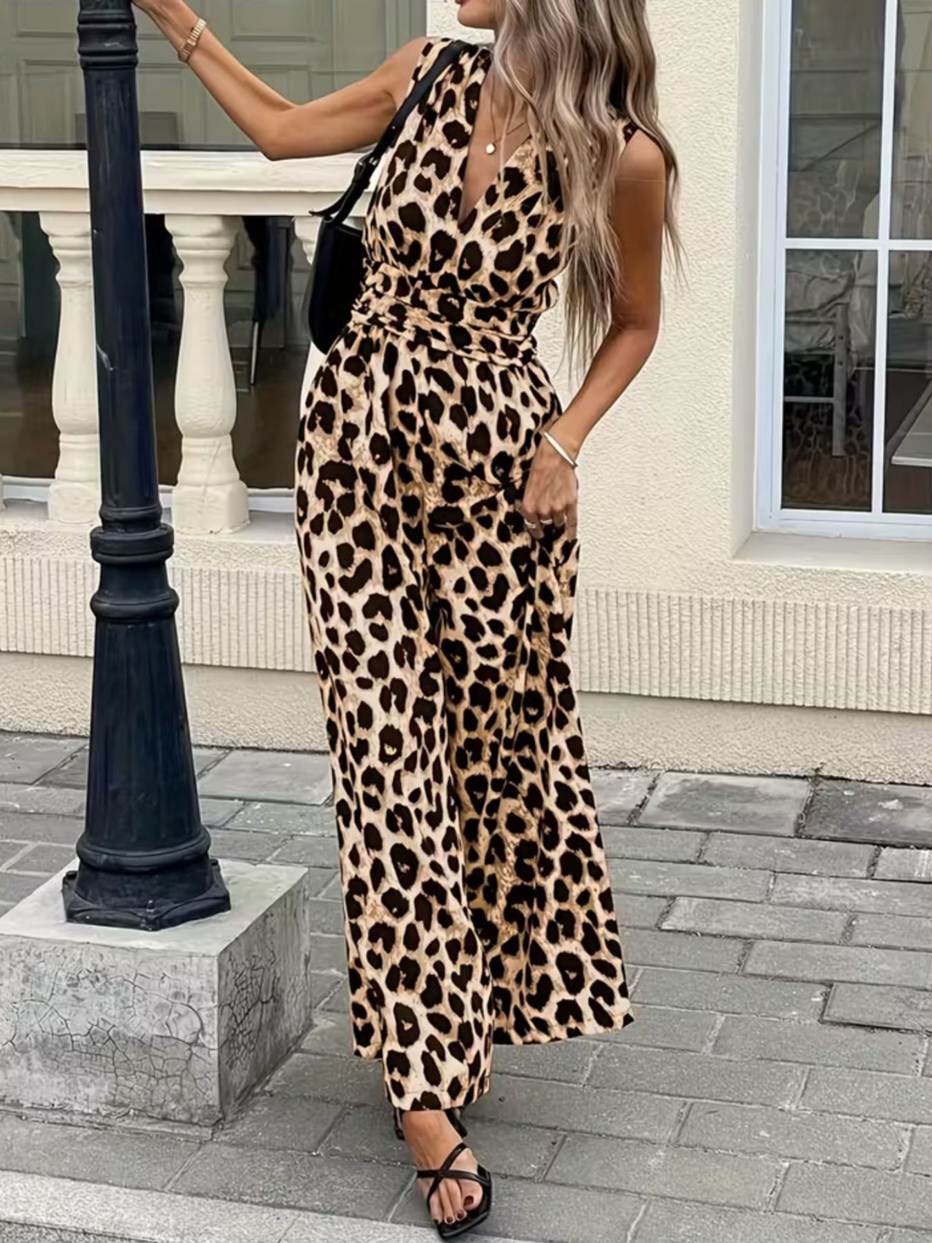 Sleeveless V-Neck Leopard Print Wide Leg Jumpsuit