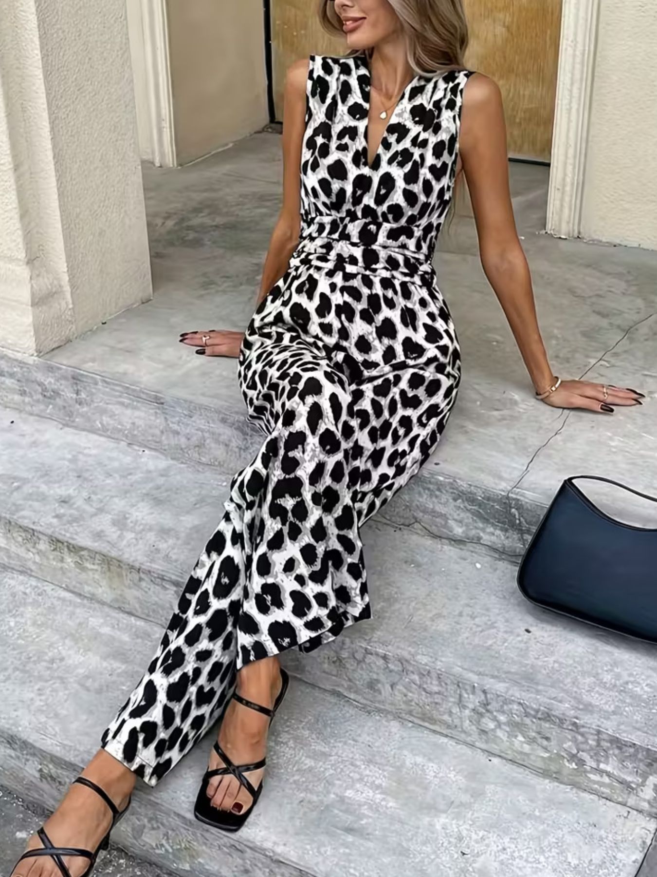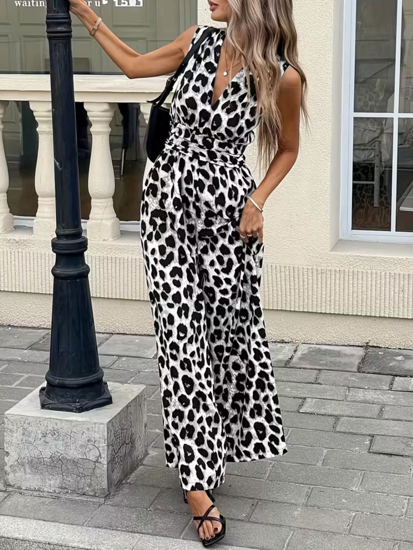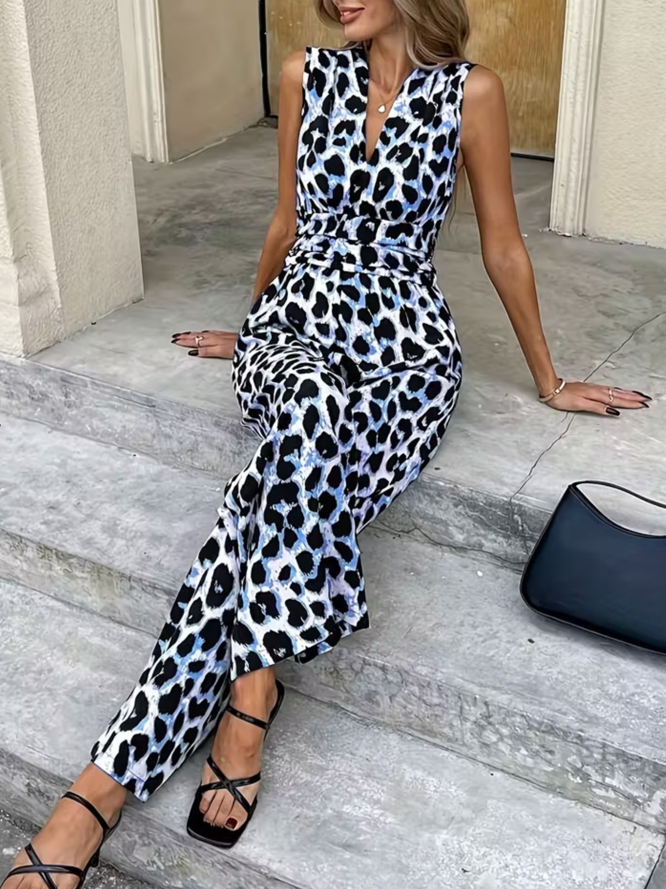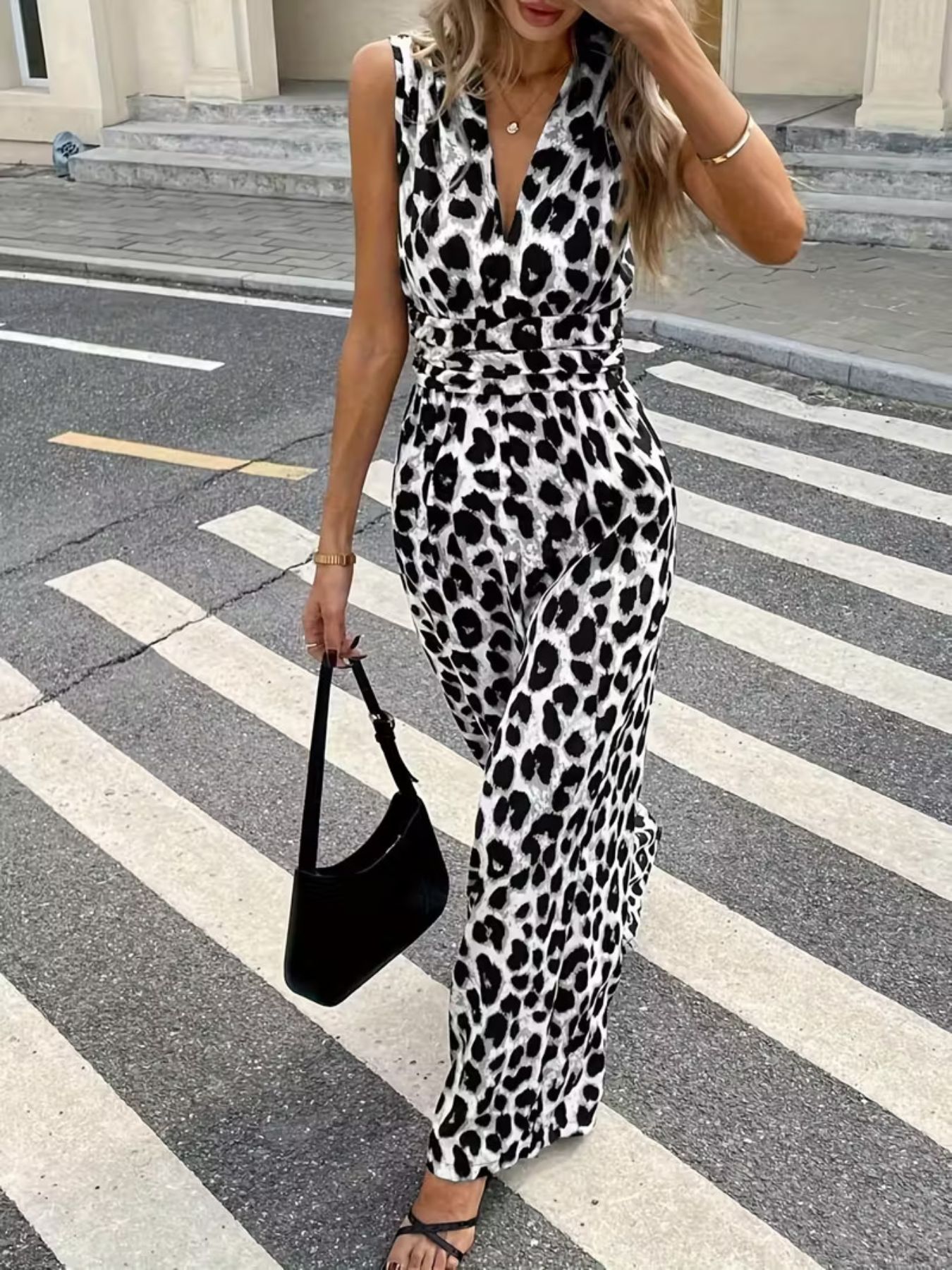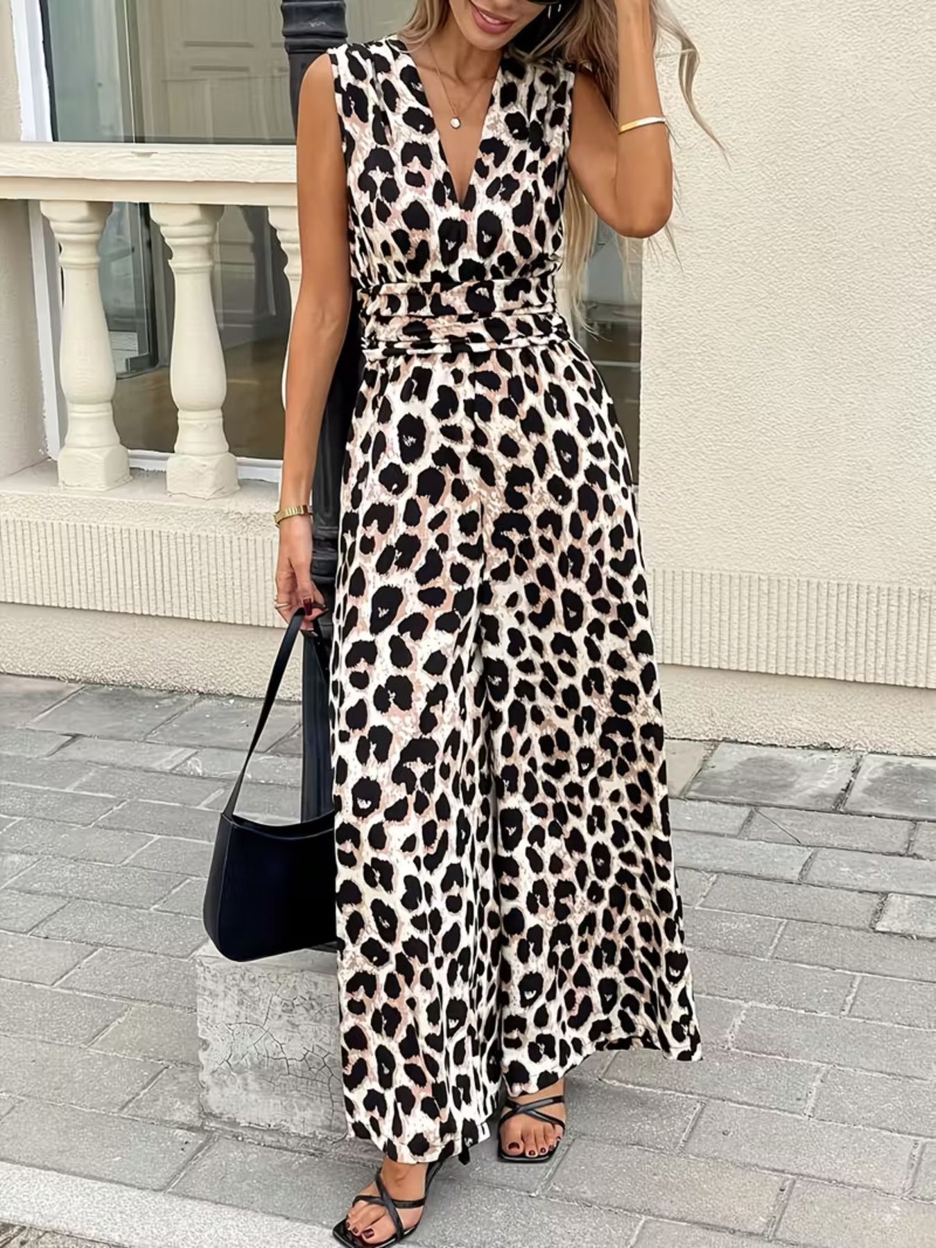 Sleeveless V-Neck Leopard Print Wide Leg Jumpsuit
