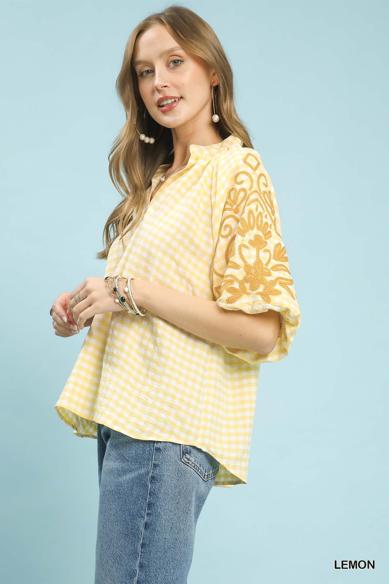 Umgee Gingham Embroidered Balloon Sleeve Top
